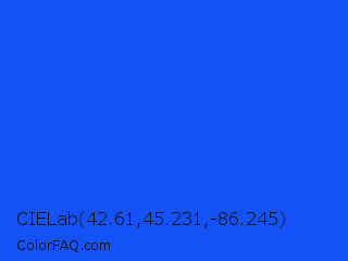 CIELab 42.61,45.231,-86.245 Color is a normal blue color and the nearest color is Blue RYB #0247fe. Hex code #1452f7 and RGB value is rgb(20,82,247). In RGB color space, this color is composed of 8% red, 32% green, 97% blue, In CMYK color space, this color is composed of 92% cyan, 67% magenta, 0% yellow , 3% black , In HSL color space, this color has a hue angle of 224° , 93% saturation and 52% lightness.