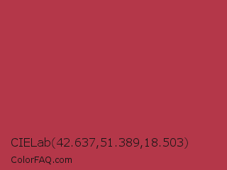 CIELab 42.637,51.389,18.503 Color is a normal red color and the nearest color is Amaranth Purple #ab274f. Hex code #b43749 and RGB value is rgb(180,55,73). In RGB color space, this color is composed of 71% red, 22% green, 29% blue, In CMYK color space, this color is composed of 0% cyan, 69% magenta, 59% yellow , 29% black , In HSL color space, this color has a hue angle of 351° , 53% saturation and 46% lightness.