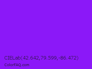 CIELab 42.642,79.599,-86.472 Color is a normal purple color and the nearest color is Veronica #a020f0. Hex code #8b18f8 and RGB value is rgb(139,24,248). In RGB color space, this color is composed of 55% red, 9% green, 97% blue, In CMYK color space, this color is composed of 44% cyan, 90% magenta, 0% yellow , 3% black , In HSL color space, this color has a hue angle of 271° , 94% saturation and 53% lightness.