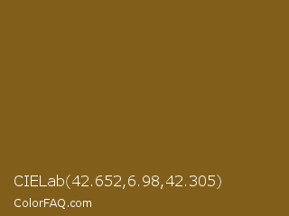 CIELab 42.652,6.98,42.305 Color is a dark orange color and the nearest color is Grizzly #885818. Hex code #815f1a and RGB value is rgb(129,95,26). In RGB color space, this color is composed of 51% red, 37% green, 10% blue, In CMYK color space, this color is composed of 0% cyan, 26% magenta, 80% yellow , 49% black , In HSL color space, this color has a hue angle of 40° , 66% saturation and 30% lightness.