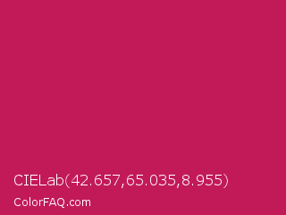 CIELab 42.657,65.035,8.955 Color is a normal rose color and the nearest color is Rose Red #c21e56. Hex code #c21a59 and RGB value is rgb(194,26,89). In RGB color space, this color is composed of 76% red, 10% green, 35% blue, In CMYK color space, this color is composed of 0% cyan, 87% magenta, 54% yellow , 24% black , In HSL color space, this color has a hue angle of 338° , 76% saturation and 43% lightness.