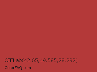 CIELab 42.65,49.585,28.292 Color is a normal red color and the nearest color is Well Read #b43332. Hex code #b43939 and RGB value is rgb(180,57,57). In RGB color space, this color is composed of 71% red, 22% green, 22% blue, In CMYK color space, this color is composed of 0% cyan, 68% magenta, 68% yellow , 29% black , In HSL color space, this color has a hue angle of 0° , 52% saturation and 46% lightness.
