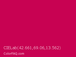 CIELab 42.661,69.06,13.562 Color is a normal rose color and the nearest color is Rubine Red #d10056. Hex code #c80252 and RGB value is rgb(200,2,82). In RGB color space, this color is composed of 78% red, 1% green, 32% blue, In CMYK color space, this color is composed of 0% cyan, 99% magenta, 59% yellow , 22% black , In HSL color space, this color has a hue angle of 336° , 98% saturation and 40% lightness.
