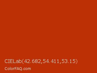 CIELab 42.682,54.411,53.15 Color is a normal red color and the nearest color is Mahogany #c04000. Hex code #bd3006 and RGB value is rgb(189,48,6). In RGB color space, this color is composed of 74% red, 19% green, 2% blue, In CMYK color space, this color is composed of 0% cyan, 75% magenta, 97% yellow , 26% black , In HSL color space, this color has a hue angle of 14° , 94% saturation and 38% lightness.