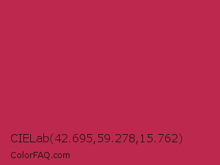 CIELab 42.695,59.278,15.762 Color is a normal red color and the nearest color is Maroon Flush #c32148. Hex code #bd294e and RGB value is rgb(189,41,78). In RGB color space, this color is composed of 74% red, 16% green, 31% blue, In CMYK color space, this color is composed of 0% cyan, 78% magenta, 59% yellow , 26% black , In HSL color space, this color has a hue angle of 345° , 64% saturation and 45% lightness.