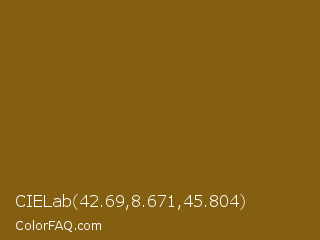 CIELab 42.69,8.671,45.804 Color is a dark orange color and the nearest color is Grizzly #885818. Hex code #845e11 and RGB value is rgb(132,94,17). In RGB color space, this color is composed of 52% red, 37% green, 7% blue, In CMYK color space, this color is composed of 0% cyan, 29% magenta, 87% yellow , 48% black , In HSL color space, this color has a hue angle of 40° , 77% saturation and 29% lightness.