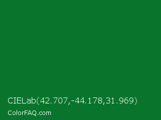 CIELab 42.707,-44.178,31.969 Color is a dark green color and the nearest color is La Salle Green #087830. Hex code #09752c and RGB value is rgb(9,117,44). In RGB color space, this color is composed of 4% red, 46% green, 17% blue, In CMYK color space, this color is composed of 92% cyan, 0% magenta, 62% yellow , 54% black , In HSL color space, this color has a hue angle of 139° , 86% saturation and 25% lightness.