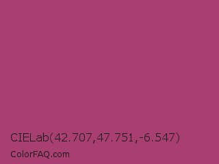 CIELab 42.707,47.751,-6.547 Color is a normal rose color and the nearest color is Rouge #a23b6c. Hex code #a73f71 and RGB value is rgb(167,63,113). In RGB color space, this color is composed of 65% red, 25% green, 44% blue, In CMYK color space, this color is composed of 0% cyan, 62% magenta, 32% yellow , 35% black , In HSL color space, this color has a hue angle of 331° , 45% saturation and 45% lightness.