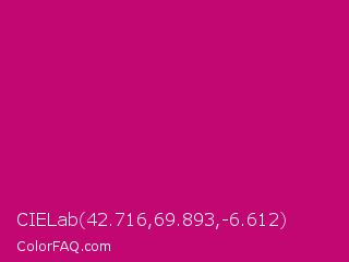CIELab 42.716,69.893,-6.612 Color is a normal magenta color and the nearest color is Red Violet #c71585. Hex code #c30772 and RGB value is rgb(195,7,114). In RGB color space, this color is composed of 76% red, 3% green, 45% blue, In CMYK color space, this color is composed of 0% cyan, 96% magenta, 42% yellow , 24% black , In HSL color space, this color has a hue angle of 326° , 93% saturation and 40% lightness.