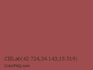 CIELab 42.724,34.143,15.519 Color is a normal red color and the nearest color is Middle Red Purple #a55353. Hex code #9e4c4d and RGB value is rgb(158,76,77). In RGB color space, this color is composed of 62% red, 30% green, 30% blue, In CMYK color space, this color is composed of 0% cyan, 52% magenta, 51% yellow , 38% black , In HSL color space, this color has a hue angle of 359° , 35% saturation and 46% lightness.