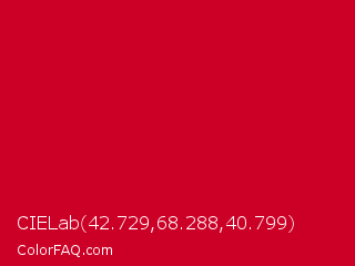 CIELab 42.729,68.288,40.799 Color is a normal red color and the nearest color is Monza #c7031e. Hex code #cc0026 and RGB value is rgb(204,0,38). In RGB color space, this color is composed of 80% red, 0% green, 15% blue, In CMYK color space, this color is composed of 0% cyan, 100% magenta, 81% yellow , 20% black , In HSL color space, this color has a hue angle of 349° , 100% saturation and 40% lightness.