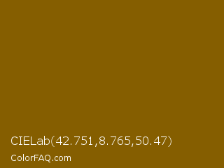 CIELab 42.751,8.765,50.47 Color is a dark orange color and the nearest color is Rusty Nail #86560a. Hex code #855e00 and RGB value is rgb(133,94,0). In RGB color space, this color is composed of 52% red, 37% green, 0% blue, In CMYK color space, this color is composed of 0% cyan, 29% magenta, 100% yellow , 48% black , In HSL color space, this color has a hue angle of 42° , 100% saturation and 26% lightness.
