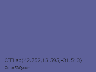 CIELab 42.752,13.595,-31.513 Color is a normal blue color and the nearest color is Dark Blue Gray #666699. Hex code #5d6099 and RGB value is rgb(93,96,153). In RGB color space, this color is composed of 36% red, 38% green, 60% blue, In CMYK color space, this color is composed of 39% cyan, 37% magenta, 0% yellow , 40% black , In HSL color space, this color has a hue angle of 237° , 24% saturation and 48% lightness.