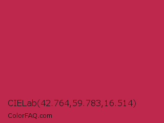 CIELab 42.764,59.783,16.514 Color is a normal red color and the nearest color is Maroon Flush #c32148. Hex code #be284d and RGB value is rgb(190,40,77). In RGB color space, this color is composed of 75% red, 16% green, 30% blue, In CMYK color space, this color is composed of 0% cyan, 79% magenta, 59% yellow , 25% black , In HSL color space, this color has a hue angle of 345° , 65% saturation and 45% lightness.
