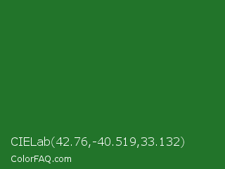 CIELab 42.76,-40.519,33.132 Color is a dark green color and the nearest color is Forest Green #228b22. Hex code #22742a and RGB value is rgb(34,116,42). In RGB color space, this color is composed of 13% red, 45% green, 16% blue, In CMYK color space, this color is composed of 71% cyan, 0% magenta, 64% yellow , 55% black , In HSL color space, this color has a hue angle of 126° , 55% saturation and 29% lightness.