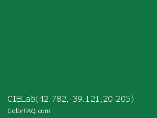 CIELab 42.782,-39.121,20.205 Color is a dark green color and the nearest color is Dark Spring Green #177245. Hex code #127442 and RGB value is rgb(18,116,66). In RGB color space, this color is composed of 7% red, 45% green, 26% blue, In CMYK color space, this color is composed of 84% cyan, 0% magenta, 43% yellow , 55% black , In HSL color space, this color has a hue angle of 149° , 73% saturation and 26% lightness.