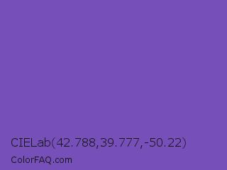 CIELab 42.788,39.777,-50.22 Color is a normal violet color and the nearest color is Studio #714ab2. Hex code #774fb9 and RGB value is rgb(119,79,185). In RGB color space, this color is composed of 47% red, 31% green, 73% blue, In CMYK color space, this color is composed of 36% cyan, 57% magenta, 0% yellow , 27% black , In HSL color space, this color has a hue angle of 263° , 43% saturation and 52% lightness.