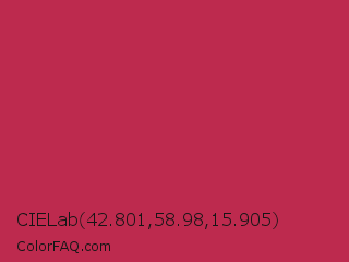 CIELab 42.801,58.98,15.905 Color is a normal red color and the nearest color is Dingy Dungeon #c53151. Hex code #bd2a4e and RGB value is rgb(189,42,78). In RGB color space, this color is composed of 74% red, 16% green, 31% blue, In CMYK color space, this color is composed of 0% cyan, 78% magenta, 59% yellow , 26% black , In HSL color space, this color has a hue angle of 345° , 64% saturation and 45% lightness.
