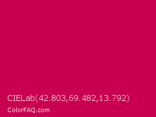 CIELab 42.803,69.482,13.792 Color is a normal rose color and the nearest color is Rubine Red #d10056. Hex code #c90052 and RGB value is rgb(201,0,82). In RGB color space, this color is composed of 79% red, 0% green, 32% blue, In CMYK color space, this color is composed of 0% cyan, 100% magenta, 59% yellow , 21% black , In HSL color space, this color has a hue angle of 336° , 100% saturation and 39% lightness.