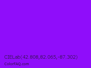 CIELab 42.808,82.065,-87.302 Color is a normal purple color and the nearest color is Electric Violet #8f00ff. Hex code #8f0dfa and RGB value is rgb(143,13,250). In RGB color space, this color is composed of 56% red, 5% green, 98% blue, In CMYK color space, this color is composed of 43% cyan, 95% magenta, 0% yellow , 2% black , In HSL color space, this color has a hue angle of 273° , 96% saturation and 52% lightness.