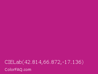 CIELab 42.814,66.872,-17.136 Color is a normal magenta color and the nearest color is Red Violet #c71585. Hex code #bb1c83 and RGB value is rgb(187,28,131). In RGB color space, this color is composed of 73% red, 11% green, 51% blue, In CMYK color space, this color is composed of 0% cyan, 85% magenta, 30% yellow , 27% black , In HSL color space, this color has a hue angle of 321° , 74% saturation and 42% lightness.