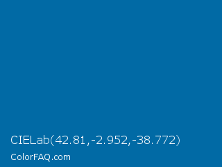CIELab 42.81,-2.952,-38.772 Color is a normal blue color and the nearest color is Sapphire Blue #0067a5. Hex code #016aa5 and RGB value is rgb(1,106,165). In RGB color space, this color is composed of 0% red, 42% green, 65% blue, In CMYK color space, this color is composed of 99% cyan, 36% magenta, 0% yellow , 35% black , In HSL color space, this color has a hue angle of 202° , 99% saturation and 33% lightness.