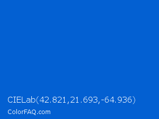 CIELab 42.821,21.693,-64.936 Color is a normal blue color and the nearest color is Science Blue #0066cc. Hex code #0360d2 and RGB value is rgb(3,96,210). In RGB color space, this color is composed of 1% red, 38% green, 82% blue, In CMYK color space, this color is composed of 99% cyan, 54% magenta, 0% yellow , 18% black , In HSL color space, this color has a hue angle of 213° , 97% saturation and 42% lightness.