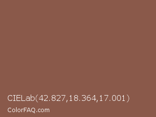 CIELab 42.827,18.364,17.001 Color is a normal red color and the nearest color is Spicy Mix #8b5f4d. Hex code #8a594a and RGB value is rgb(138,89,74). In RGB color space, this color is composed of 54% red, 35% green, 29% blue, In CMYK color space, this color is composed of 0% cyan, 36% magenta, 46% yellow , 46% black , In HSL color space, this color has a hue angle of 14° , 30% saturation and 42% lightness.