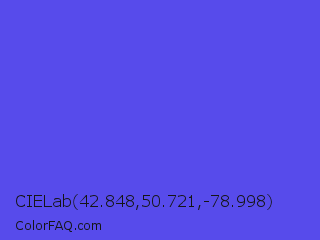 CIELab 42.848,50.721,-78.998 Color is a light indigo color and the nearest color is Majorelle Blue #6050dc. Hex code #574beb and RGB value is rgb(87,75,235). In RGB color space, this color is composed of 34% red, 29% green, 92% blue, In CMYK color space, this color is composed of 63% cyan, 68% magenta, 0% yellow , 8% black , In HSL color space, this color has a hue angle of 245° , 80% saturation and 61% lightness.