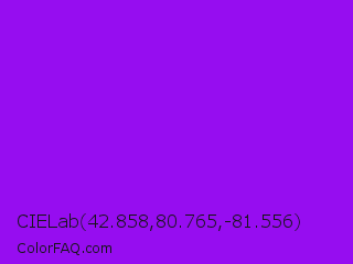 CIELab 42.858,80.765,-81.556 Color is a normal purple color and the nearest color is Electric Violet #8f00ff. Hex code #960df0 and RGB value is rgb(150,13,240). In RGB color space, this color is composed of 59% red, 5% green, 94% blue, In CMYK color space, this color is composed of 38% cyan, 95% magenta, 0% yellow , 6% black , In HSL color space, this color has a hue angle of 276° , 90% saturation and 50% lightness.