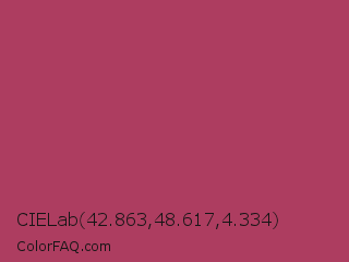CIELab 42.863,48.617,4.334 Color is a normal rose color and the nearest color is Hippie Pink #ae4560. Hex code #ad3d60 and RGB value is rgb(173,61,96). In RGB color space, this color is composed of 68% red, 24% green, 38% blue, In CMYK color space, this color is composed of 0% cyan, 65% magenta, 45% yellow , 32% black , In HSL color space, this color has a hue angle of 341° , 48% saturation and 46% lightness.
