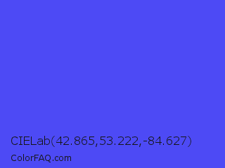 CIELab 42.865,53.222,-84.627 Color is a light indigo color and the nearest color is Ultramarine Blue #4166f5. Hex code #4d4af5 and RGB value is rgb(77,74,245). In RGB color space, this color is composed of 30% red, 29% green, 96% blue, In CMYK color space, this color is composed of 69% cyan, 70% magenta, 0% yellow , 4% black , In HSL color space, this color has a hue angle of 241° , 90% saturation and 63% lightness.