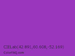 CIELab 42.891,60.608,-52.169 Color is a normal purple color and the nearest color is Dark Orchid #9932cc. Hex code #9936bd and RGB value is rgb(153,54,189). In RGB color space, this color is composed of 60% red, 21% green, 74% blue, In CMYK color space, this color is composed of 19% cyan, 71% magenta, 0% yellow , 26% black , In HSL color space, this color has a hue angle of 284° , 56% saturation and 48% lightness.