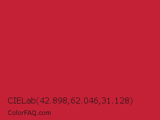 CIELab 42.898,62.046,31.128 Color is a normal red color and the nearest color is Cardinal #c41e3a. Hex code #c42136 and RGB value is rgb(196,33,54). In RGB color space, this color is composed of 77% red, 13% green, 21% blue, In CMYK color space, this color is composed of 0% cyan, 83% magenta, 72% yellow , 23% black , In HSL color space, this color has a hue angle of 352° , 71% saturation and 45% lightness.