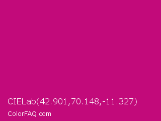CIELab 42.901,70.148,-11.327 Color is a normal magenta color and the nearest color is Red Violet #c71585. Hex code #c20a7a and RGB value is rgb(194,10,122). In RGB color space, this color is composed of 76% red, 4% green, 48% blue, In CMYK color space, this color is composed of 0% cyan, 95% magenta, 37% yellow , 24% black , In HSL color space, this color has a hue angle of 323° , 90% saturation and 40% lightness.