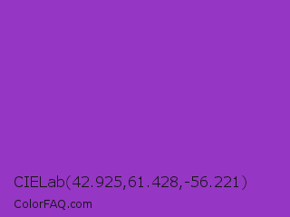 CIELab 42.925,61.428,-56.221 Color is a normal purple color and the nearest color is Dark Orchid #9932cc. Hex code #9636c4 and RGB value is rgb(150,54,196). In RGB color space, this color is composed of 59% red, 21% green, 77% blue, In CMYK color space, this color is composed of 23% cyan, 72% magenta, 0% yellow , 23% black , In HSL color space, this color has a hue angle of 281° , 57% saturation and 49% lightness.