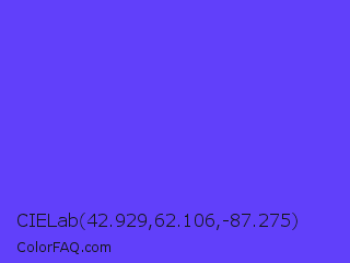 CIELab 42.929,62.106,-87.275 Color is a light indigo color and the nearest color is Majorelle Blue #6050dc. Hex code #6140fa and RGB value is rgb(97,64,250). In RGB color space, this color is composed of 38% red, 25% green, 98% blue, In CMYK color space, this color is composed of 61% cyan, 74% magenta, 0% yellow , 2% black , In HSL color space, this color has a hue angle of 251° , 95% saturation and 62% lightness.