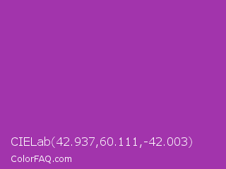 CIELab 42.937,60.111,-42.003 Color is a normal magenta color and the nearest color is Purpureus #9a4eae. Hex code #a234ac and RGB value is rgb(162,52,172). In RGB color space, this color is composed of 64% red, 20% green, 67% blue, In CMYK color space, this color is composed of 6% cyan, 70% magenta, 0% yellow , 33% black , In HSL color space, this color has a hue angle of 295° , 54% saturation and 44% lightness.