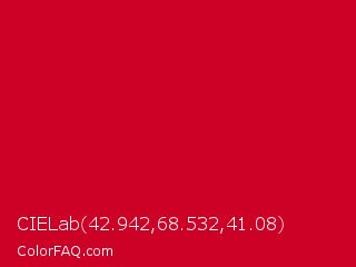 CIELab 42.942,68.532,41.08 Color is a normal red color and the nearest color is Monza #c7031e. Hex code #cd0026 and RGB value is rgb(205,0,38). In RGB color space, this color is composed of 80% red, 0% green, 15% blue, In CMYK color space, this color is composed of 0% cyan, 100% magenta, 81% yellow , 20% black , In HSL color space, this color has a hue angle of 349° , 100% saturation and 40% lightness.