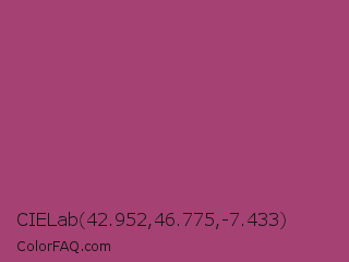 CIELab 42.952,46.775,-7.433 Color is a normal rose color and the nearest color is Magenta Haze #9f4576. Hex code #a64173 and RGB value is rgb(166,65,115). In RGB color space, this color is composed of 65% red, 25% green, 45% blue, In CMYK color space, this color is composed of 0% cyan, 61% magenta, 31% yellow , 35% black , In HSL color space, this color has a hue angle of 330° , 44% saturation and 45% lightness.