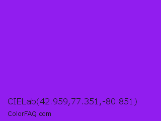 CIELab 42.959,77.351,-80.851 Color is a normal purple color and the nearest color is Veronica #a020f0. Hex code #911def and RGB value is rgb(145,29,239). In RGB color space, this color is composed of 57% red, 11% green, 94% blue, In CMYK color space, this color is composed of 39% cyan, 88% magenta, 0% yellow , 6% black , In HSL color space, this color has a hue angle of 273° , 87% saturation and 53% lightness.