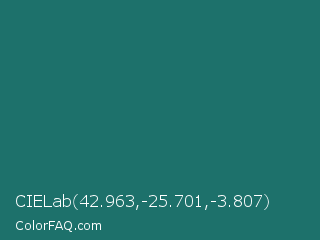CIELab 42.963,-25.701,-3.807 Color is a dark cyan color and the nearest color is Genoa #15736b. Hex code #1d716b and RGB value is rgb(29,113,107). In RGB color space, this color is composed of 11% red, 44% green, 42% blue, In CMYK color space, this color is composed of 74% cyan, 0% magenta, 5% yellow , 56% black , In HSL color space, this color has a hue angle of 176° , 59% saturation and 28% lightness.
