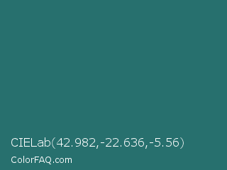 CIELab 42.982,-22.636,-5.56 Color is a dark cyan color and the nearest color is Myrtle Green #317873. Hex code #27706e and RGB value is rgb(39,112,110). In RGB color space, this color is composed of 15% red, 44% green, 43% blue, In CMYK color space, this color is composed of 65% cyan, 0% magenta, 2% yellow , 56% black , In HSL color space, this color has a hue angle of 178° , 48% saturation and 30% lightness.