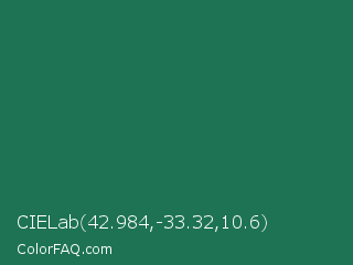 CIELab 42.984,-33.32,10.6 Color is a dark green color and the nearest color is Dark Spring Green #177245. Hex code #1d7353 and RGB value is rgb(29,115,83). In RGB color space, this color is composed of 11% red, 45% green, 33% blue, In CMYK color space, this color is composed of 75% cyan, 0% magenta, 28% yellow , 55% black , In HSL color space, this color has a hue angle of 158° , 60% saturation and 28% lightness.