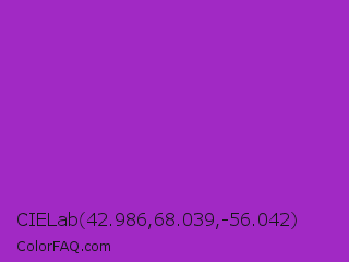 CIELab 42.986,68.039,-56.042 Color is a normal purple color and the nearest color is Dark Orchid #9932cc. Hex code #a129c4 and RGB value is rgb(161,41,196). In RGB color space, this color is composed of 63% red, 16% green, 77% blue, In CMYK color space, this color is composed of 18% cyan, 79% magenta, 0% yellow , 23% black , In HSL color space, this color has a hue angle of 286° , 65% saturation and 46% lightness.