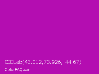 CIELab 43.012,73.926,-44.67 Color is a normal magenta color and the nearest color is Heliotrope Magenta #aa00bb. Hex code #b40db1 and RGB value is rgb(180,13,177). In RGB color space, this color is composed of 71% red, 5% green, 69% blue, In CMYK color space, this color is composed of 0% cyan, 93% magenta, 2% yellow , 29% black , In HSL color space, this color has a hue angle of 301° , 87% saturation and 38% lightness.