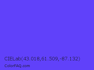 CIELab 43.018,61.509,-87.132 Color is a light indigo color and the nearest color is Majorelle Blue #6050dc. Hex code #6041fa and RGB value is rgb(96,65,250). In RGB color space, this color is composed of 38% red, 25% green, 98% blue, In CMYK color space, this color is composed of 62% cyan, 74% magenta, 0% yellow , 2% black , In HSL color space, this color has a hue angle of 250° , 95% saturation and 62% lightness.
