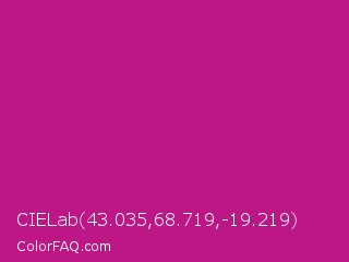 CIELab 43.035,68.719,-19.219 Color is a normal magenta color and the nearest color is Red Violet #c71585. Hex code #bd1787 and RGB value is rgb(189,23,135). In RGB color space, this color is composed of 74% red, 9% green, 53% blue, In CMYK color space, this color is composed of 0% cyan, 88% magenta, 29% yellow , 26% black , In HSL color space, this color has a hue angle of 320° , 78% saturation and 42% lightness.