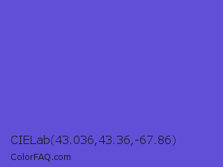 CIELab 43.036,43.36,-67.86 Color is a normal indigo color and the nearest color is Majorelle Blue #6050dc. Hex code #6050d8 and RGB value is rgb(96,80,216). In RGB color space, this color is composed of 38% red, 31% green, 85% blue, In CMYK color space, this color is composed of 56% cyan, 63% magenta, 0% yellow , 15% black , In HSL color space, this color has a hue angle of 247° , 64% saturation and 58% lightness.