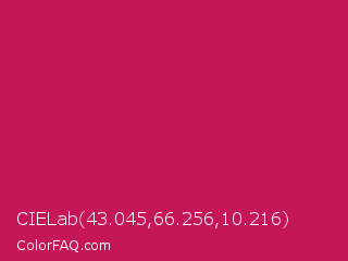 CIELab 43.045,66.256,10.216 Color is a normal rose color and the nearest color is Rose Red #c21e56. Hex code #c51758 and RGB value is rgb(197,23,88). In RGB color space, this color is composed of 77% red, 9% green, 35% blue, In CMYK color space, this color is composed of 0% cyan, 88% magenta, 55% yellow , 23% black , In HSL color space, this color has a hue angle of 338° , 79% saturation and 43% lightness.